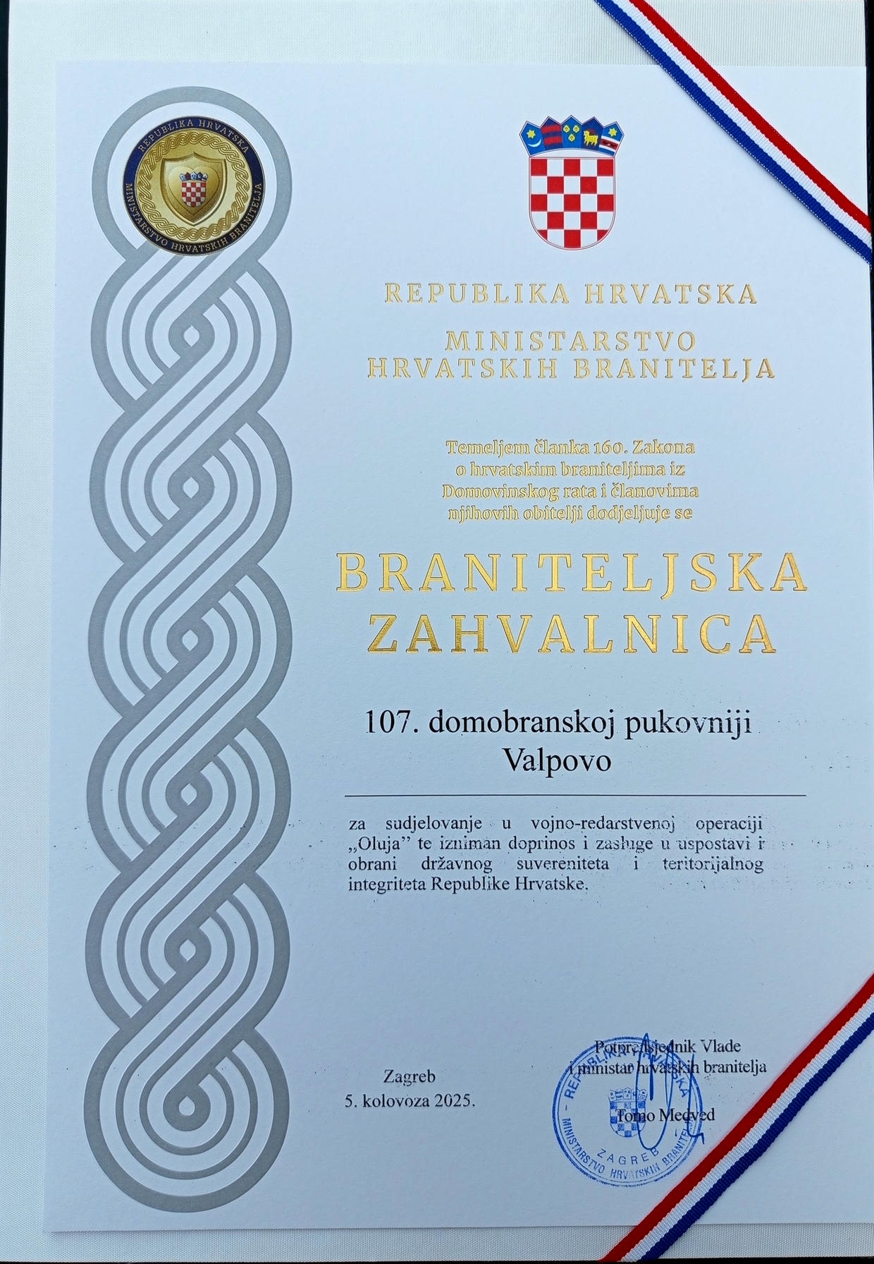 U ime 107. domobranske pukovnije Valpovo braniteljsku zahvalnicu primio je pukovnik Zdravko Birovljević, načelnik stožera 107.dp.
