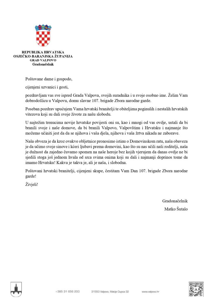 Vijenac predsjednika Republike, položio je njegov izaslanik, brigadni general Valentin Skroza, saborski zastupnik Stipan Šašlin kao izaslanik predsjednika hrvatskog sabora, Nataša Tramišak, županica osječko-baranjska kao izaslanica predsjednika Vlade RH zajedno s izaslanstvima MORH-a i Ministarstva hrvatskih branitelja, Zapovjedništvo 107. brigade, izaslanstvo Policijske uprave predvođeno Vladom Krznarićem načelnikom Policijske postaje Belišće, izaslanstvo udruga proisteklih iz Domovinskog rata te predstavnici grada Valpova s gradovima i općinama iz zone odgovornosti 107. brigade HV. Koračnicu su izveli članovi Puhačkog orkestra DVD-a Valpovo.